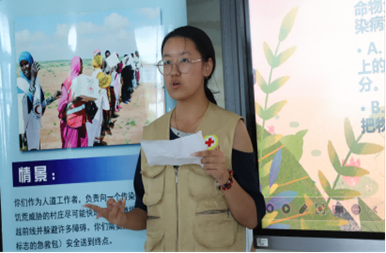 随着志愿者一声“闯关开始”,“伤员站”“人道救援站”“军事司令站”“炮兵部队站”及“战俘站”五个特色站点依次开放,教室瞬间沸腾,迅速转变成了同学们的“人道实践场”。