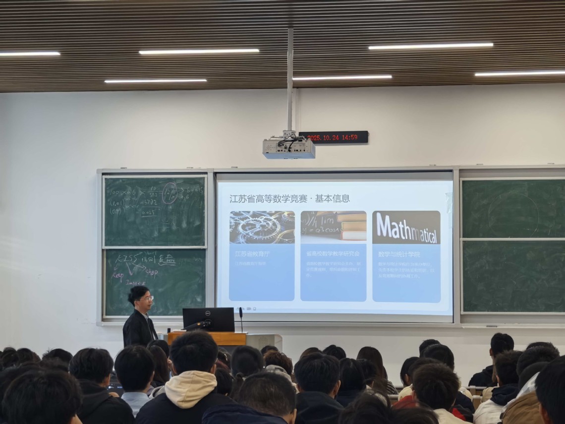 在随后的环节中,数学与统计学院沈亚良教授为新生们进行了细致深入的竞赛政策解读。沈教授围绕全国大学生数学竞赛、江苏省高等数学竞赛等赛事的规则流程、奖项设置、参赛要求及备赛要点进行了系统梳理与讲解,为有意参赛的同学指明了方向,提供了清晰的路径指引。