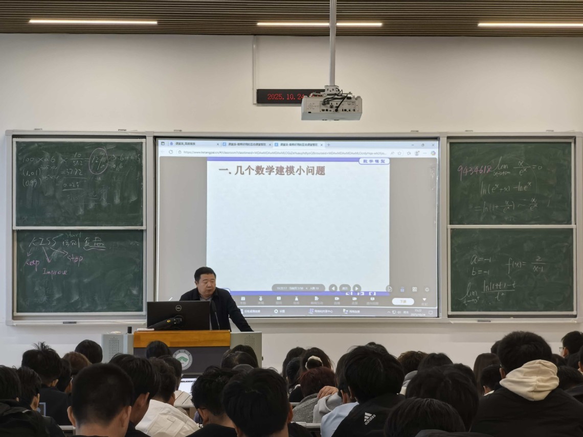 紧接着,数学与统计学院陆志峰教授带来了生动精彩的数学建模启蒙。他通过一系列经典而富有趣味性的数学建模案例,抽丝剥茧般地演绎了从实际问题抽象为数学模型,再通过求解模型解决实际问题的全过程。陆教授的讲解深入浅出,将数学建模的思想与方法鲜活地呈现在同学们面前,使大家对这一重要的科研与实践工具有了更为直观和深刻的理解。